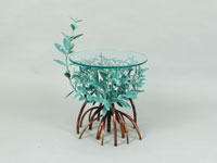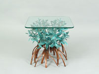 The leaves are given a patina, and the entire piece is preserved with a clear acrylic. The construction of these pieces makes them rust-free and suitable for use indoors or out.